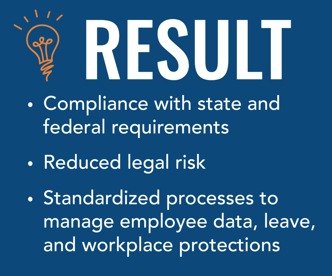 Problem: The organization faced multiple compliance risks, including California pay data requirements, sick leave, harassment training, termination procedures, and meal period tracking. Outdated infrastructure and inconsistent processes left them vulnerable to legal and regulatory challenges.